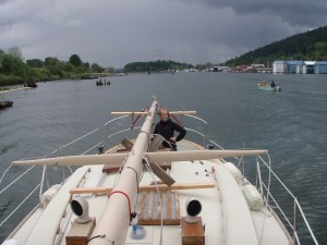 Getting her out of the slip at the yard moorage was interesting. Our slip was perpendicular to the current and to get out we had to get the stern to swing upstream. It was pretty tight maneuvering (it felt like it anyway), we had a little under 1 boat length of room behind us and a boat in the slip next to us on the downstream side. First we tried to back out with rudder to port (upstream) with me at the helm and Devon on the dock with bowline to prevent the bowsprit from getting too close to our neighbor. That didn’t work, the boat just went straight back and we didn’t have enough room to clear the neighbor to turn downstream. We tried a few times but could not get the stern to swing upstream. What finally worked was having Devon pull on the stern line from the dock to get the stern to swing upstream (he also had the bowline to prevent us from hitting the neighbor) while I backed out with rudder to port. At least we didn’t have a big audience (I guess the bad weather was good for something).