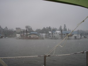 With the winter solstice past, the light part of the day should be getting longer than the dark part. It is still winter in Oregon, gray, and rainy. We have not sailed much this Winter, alas we have not finished (or started) the dodger. The last time we had the boat out it snowed on us.