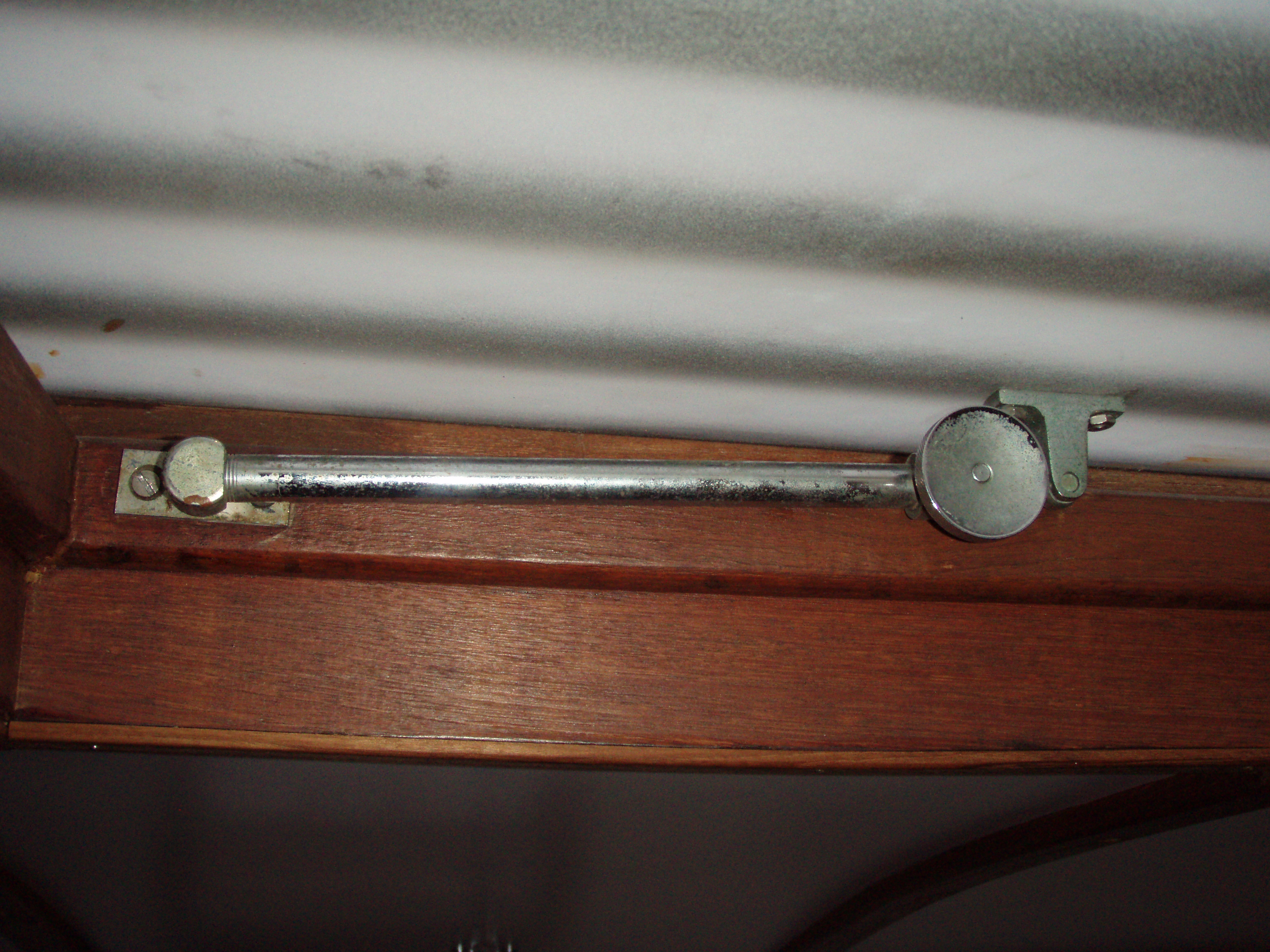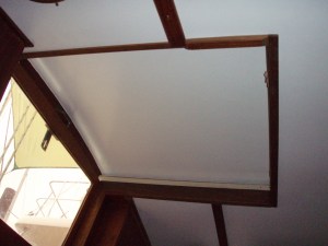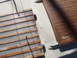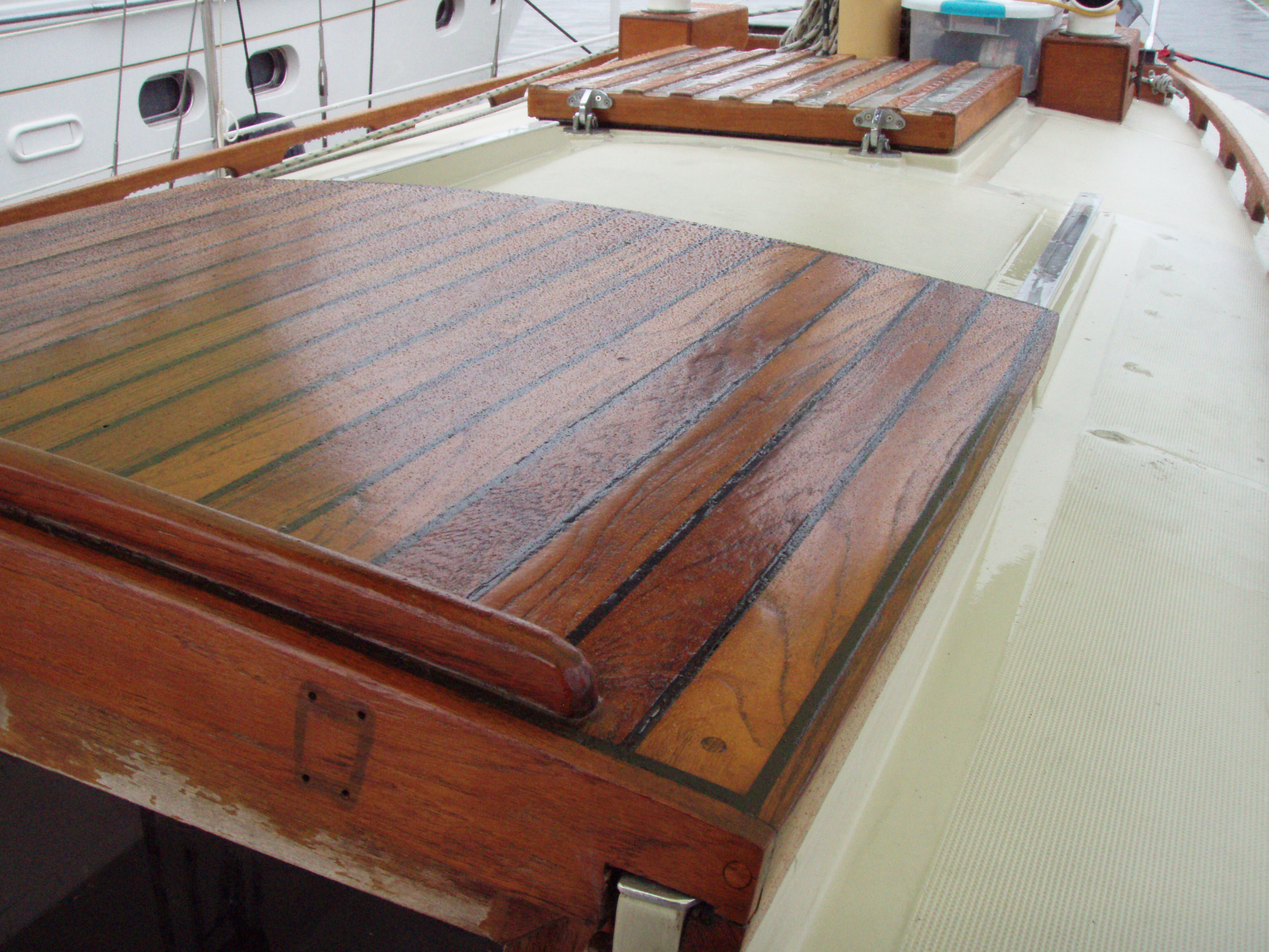 The sliding hatch had some rot in the plywood and the veneer was ruined. We elected to disassemble the hatch repair the wood, reassemble, and apply white enamel to the underside. It matches the head liner and there is no longer a dark spot in the companion way.