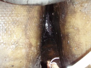 Anyway, our bilge is mostly taken up by our fresh water tank. There is access to the lowest part behind the ballast in the keel. It’s very small. The foot print is a triangle about 4 inches by 6 inches of usable space, and about 3 feet in depth.