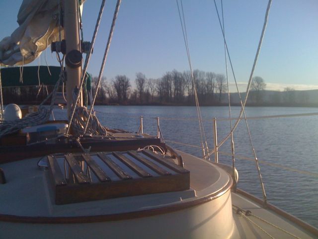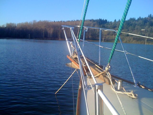 For the first time since last October we actually went sailing today!! It was a rare day of blue skies and good winds. Temps were in the upper forties and the winds were 12 to 15 knots. It was pretty darn cold sailing upwind (which is what we did most of the day) but the sunshine made it all worthwhile. Since we hadn’t been sailing in so long I was a little worried it would feel like starting over but I guess sailing is like riding a bicycle… There was quite a bit of chop and we took a fair amount of spray over the bow but it was exhilerating, not intimidating 🙂 We are now anchored in Martin Slough and loving every minute of it 😀