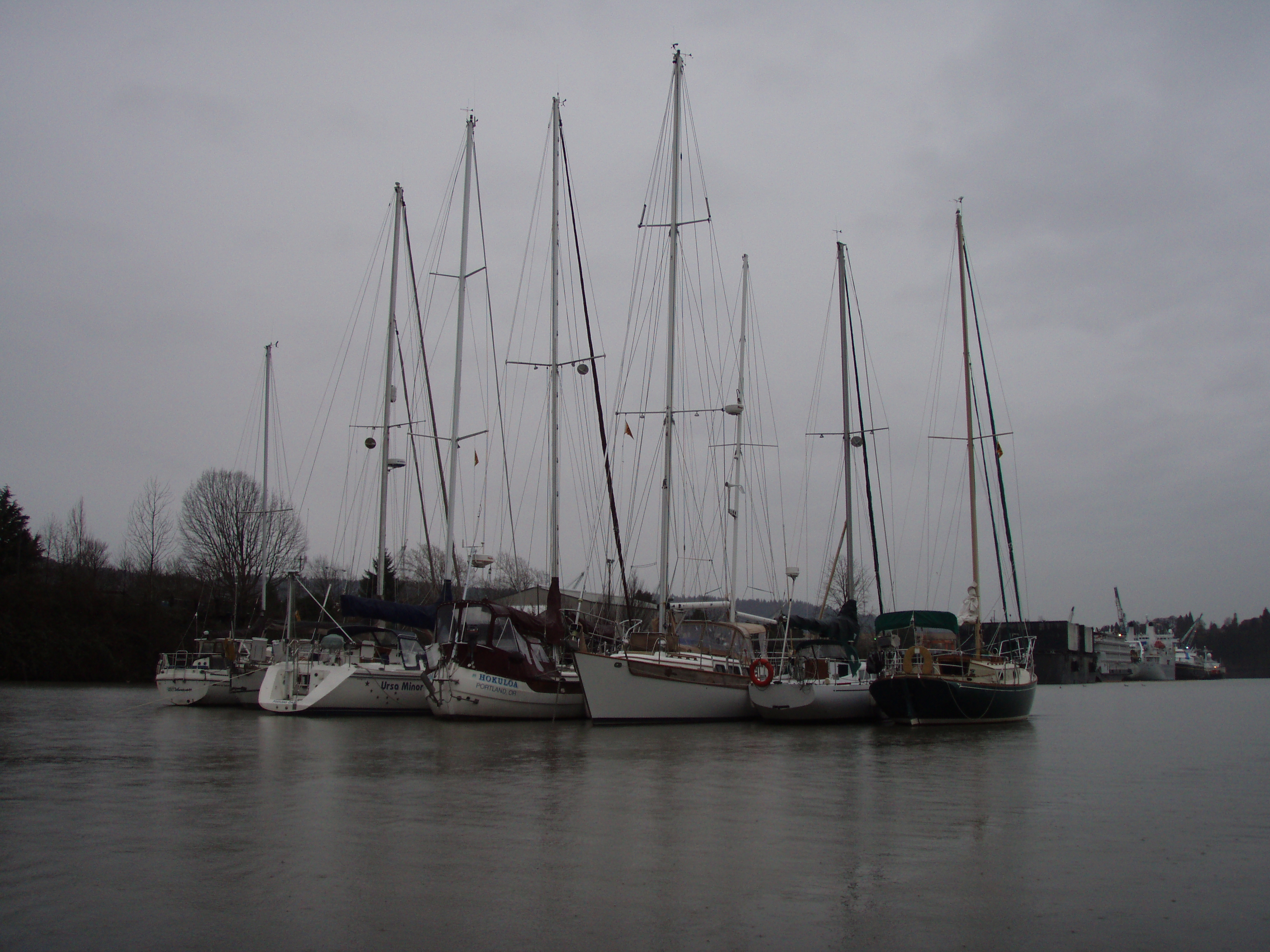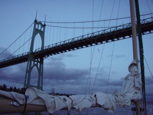 The trip on the Columbia was OK. It rained some, the Sun broke out for a few minutes, pretty much uneventful. I’m glad we had a good heater. On the Willamette we brought out the head sails and picked up a whole knot of speed motor sailing. Very quickly we came to the RR bridge and Rowan hailed for a bridge lift, the tender was in a good mood and we only waited a minute or two while a train passed. We figured the VHF antenna needs 45 feet to clear, the bridge tender reported bridge clearance at 46 feet, that was too close for comfort.