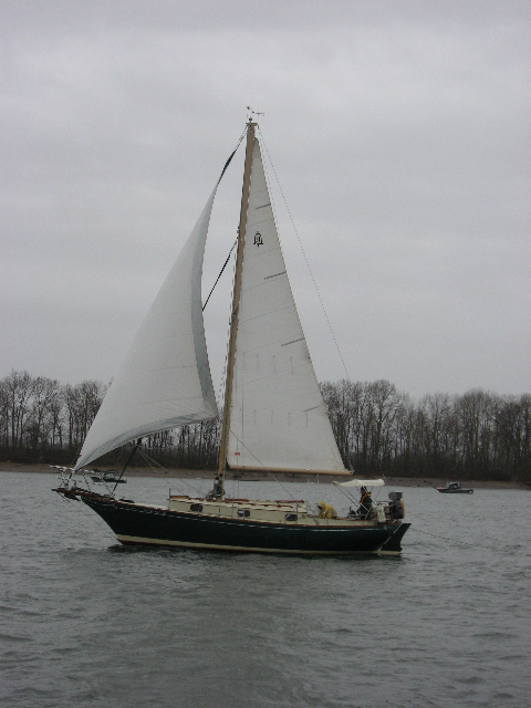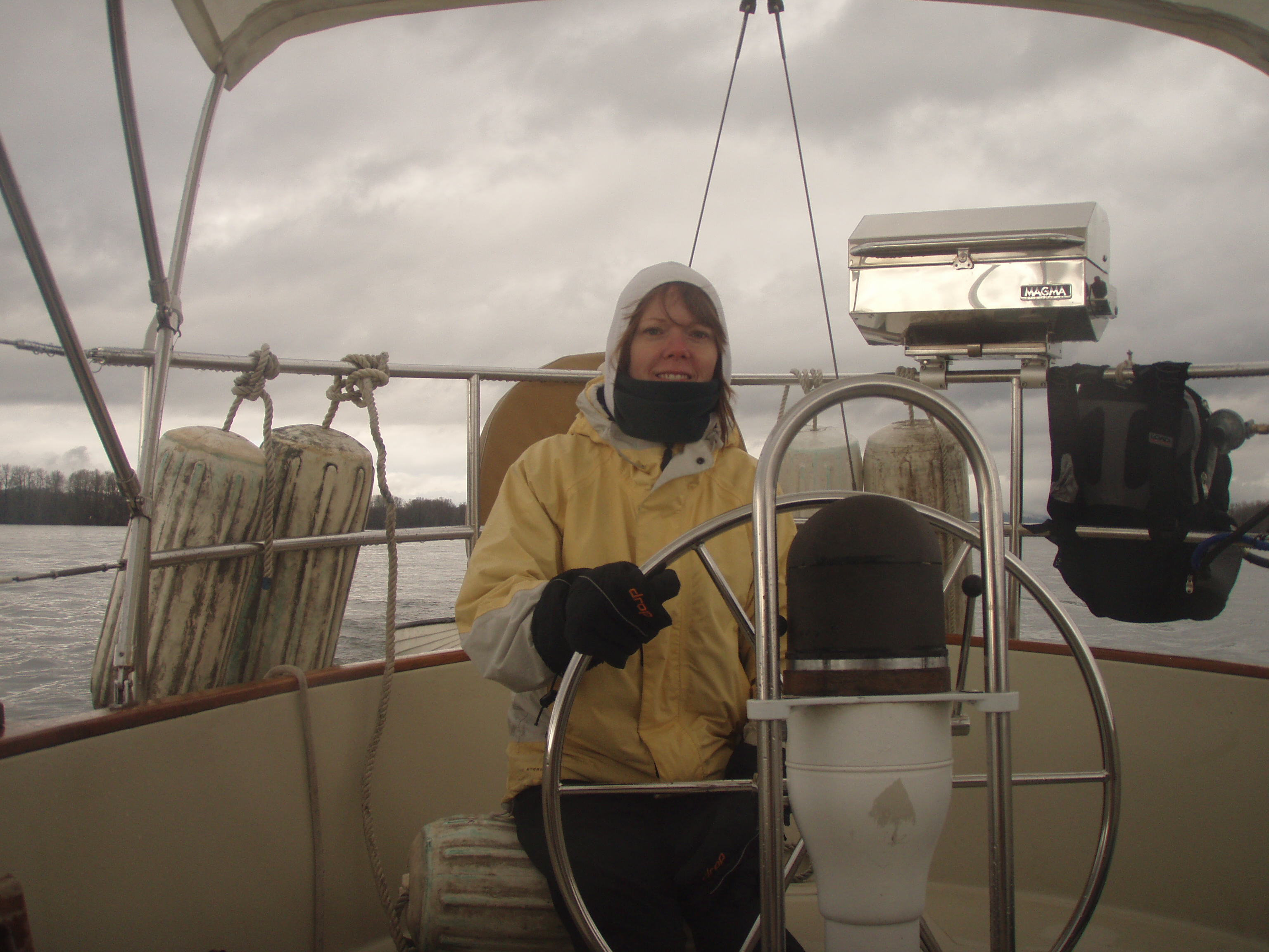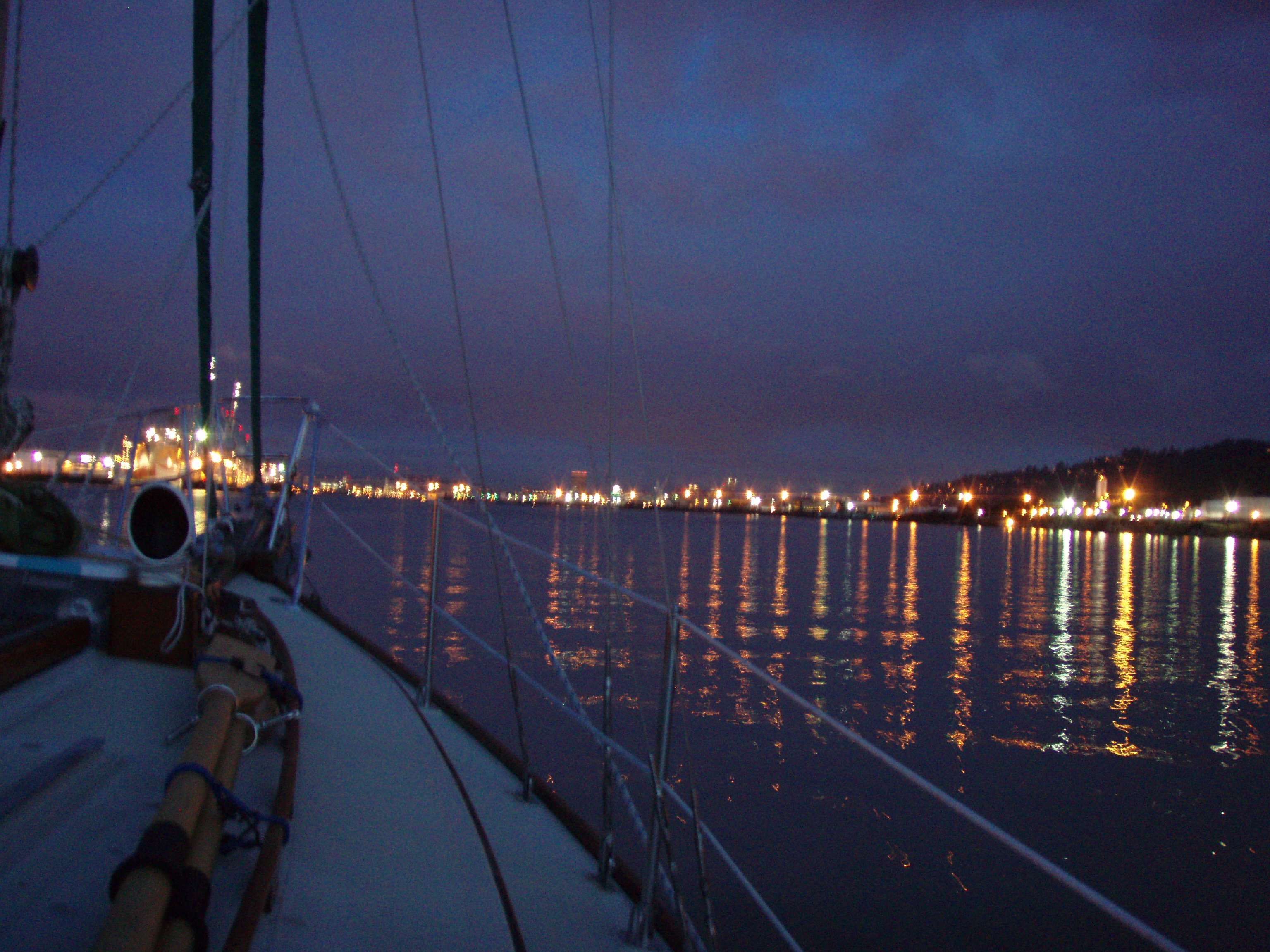 It was great fun, and full of experiences for us newbies. We woke up early on Saturday to bad weather, rain and cold. We quickly went back to bed and hoped for a break in the weather later on. Somewhere around 10 or 11 we had a light breakfast and got the boat out of the slip and to the fuel dock to take on 5 gallons of diesel, the rain had let up. So we got a late start, there was not enough wind to sail against the current. We started at river mile 86 or so, the Willamette meets the Columbia at about river mile 102, then about 6 or 7 miles on the Willamette to get to Swan Island basin. Almost 2miles to go, and we were making only about 3 kn5ots. The recent engine work means we are limited on rpm for the break in period. It was clear we were going to miss dinner, and arrive in the dark. What fun!