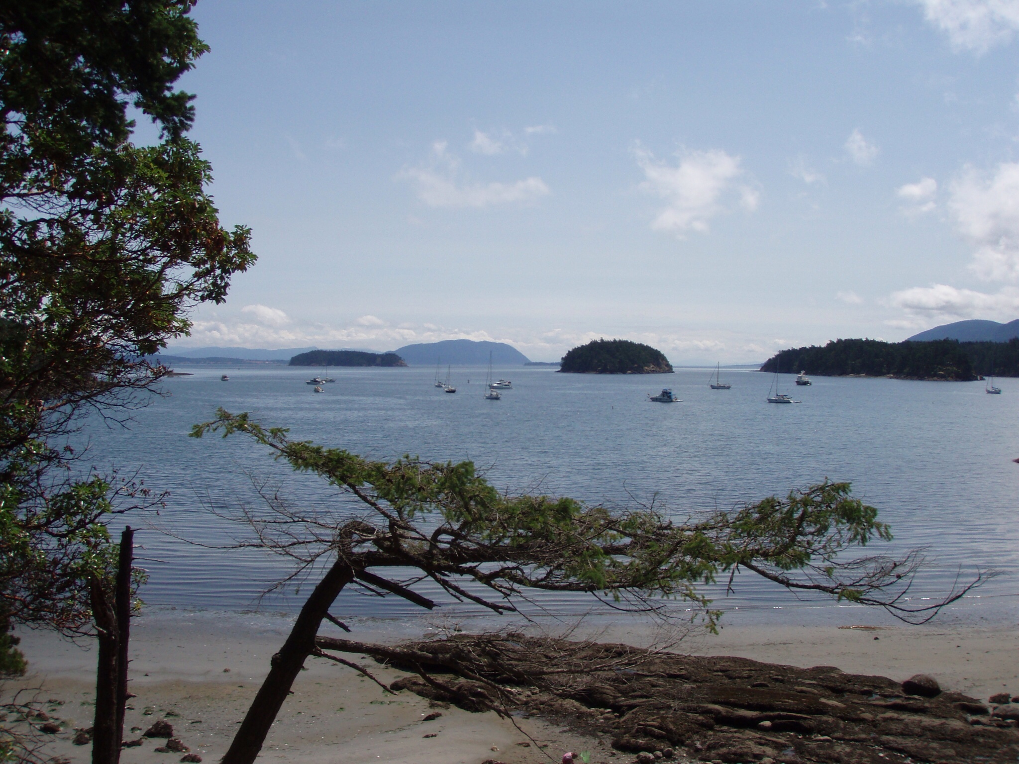 Next stop was Sucia Island where we anchored in Echo Bay. This was our favorite stop, very pretty and protected with some nice trails for stretching our legs. Much of the shore in the San Juan Islands is either private property or state owned but protected for the sake of wildlife so there aren’t actually that many undeveloped places where you can go for a walk. If you look closely you can see ‘Imi Loa in the photo to the left. There are three sailboats and one power boat just to left of center, we are the middle sailboat. If you click the photo you will get the full size image and can see our dark hull.