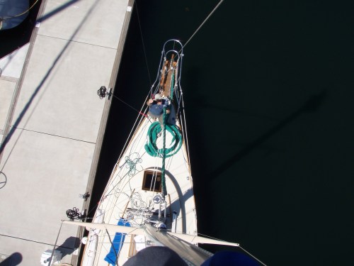 From Port Townsend it was back to Port Angeles where we enjoyed some nice weather and did a few boat projects. Now I remember what we were looking for at the Friday Harbor West Marine: Sirius XM weather! We were hoping to take the offshore route south to San Francisco which would put us out of VHF range. We didn’t have a satellite phone or SSB so we needed a source of weather information. The Sirius XM receiver we were looking for was compatible with our Garmin chartplotter so the installation would be very simple. Nobody seemed to stock what we wanted so we ordered one over the phone from a local marine electronics shop in Port Angeles. It was waiting for us when we arrived. The installation was very simple and as a bonus it didn’t even require us to drill any holes in the boat. The other things we did were sew weather cloths for the cockpit and replace our jib halyard. We had brought our Sailrite machine and still had some Sunbrella fabric left over from the dodger and bimini. I did the sewing in the cabin but all of the cutting was done on the dock since there really isn’t any place in the boat big enough to lay out a bunch of canvas. Fortunately the docks were new and very clean, though the wind piped up and made it a little tricky getting everything cut without letting any fabric blow into the water. We had purchased the line for the jib halyard in Portland but hadn’t had time to splice and install it with all the other things going on. Unfortunately we’ve already had to replace that halyard again, but that’s a story for another day.