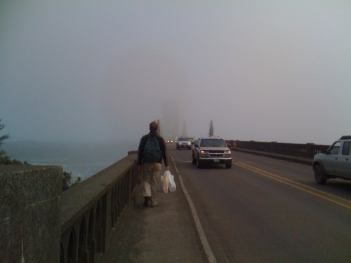We got a late start out of Newport waiting for the tide to come in. It was 10:30 by the time we cast off under sunny skies with a light west wind. By noon we were able to shut of the motor and enjoy a nice sail under jib, staysail, and main. Unfortunately by 5pm the wind had gotten light and flukey so we were back to motoring. Considering our fuel supply and lack of wind we decided we would stop for fuel in Crescent City. Our ETA was around midnight so I called the fuel dock before they closed to inquire about tying up at the fuel dock until they opened and was told it would be fine. It was interesting entering Crescent City at night. They have range lights otherwise we probably wouldn’t have tried it. With the range lights, the chart plotter, and navionics running on the ipad we had no trouble getting into the harbor. That’s not to say it wasn’t stressful, but it was without incident. Almost. According the the sketch in Charlie’s Charts the docks at Crescent City are kind of like an upside down capital Y. As you round the inner breakwater the Y is ahead of you, the left (near) side of the stem of the Y is the commercial fuel dock and the far side is the recreational fuel dock. Now making sense of what you see on a sketch and what is in front of you can be tricky, especially at night. and especially with lots of flood lights shining down into your eyes from commercial activity on the arms of the Y. We were both very focused on navigating past the several charted rocks to get to the recreational fuel dock. Gradually we both became aware of a small light moving along the dock, it seemed to be keeping pace with us. We also realized that through the background noise of our engine and whatever machinery was in use up on the dock we could here a voice yelling. Devon immediately brought the engine down to idle so we could hear better. The woman up on the dock was an employee trying to get our attention to warn us that we were heading into some rocks! It turns out that the recreational fuel dock was no longer there due to damage from the Japanese Tsunami. So we turned around and headed to the commercial fuel dock. This was the only time we have ever tied up to a commercial dock and it was interesting. It was huge, probably 10 feet above our heads and in the dark it is confusing figuring out how to tie up. The whole thing was just a mass of tires being used as bumpers/fenders and a few floats. Plus the flood lights were shining in our eyes. Someone up on the dock yelled for us to toss our lines up and he cleated them off (they were barely long enough). I climbed along the tires (and maybe a log or two?) to a ladder and climbed up to the dock. It turned out that the guy who caught our lines was the same guy I spoke with on the phone. He had church the next morning so he decided to come out at midnight to give us fuel so he wouldn’t miss the service. That was pretty amazing that he would go out of his way like that. He could have just said we needed to wait until he got out of church (now that I think about it I don’t think they are even open normally on Sundays) but he didn’t say anything about that when I talked to him on the phone. Between the lady who warned us off the rocks and the fuel dock guy we were impressed by the staff at Crescent City. We could have continued on that night but we were tired so we decided to stay at the guest dock and get some sleep. The next morning (8/19) we slept in and didn’t depart until almost noon.