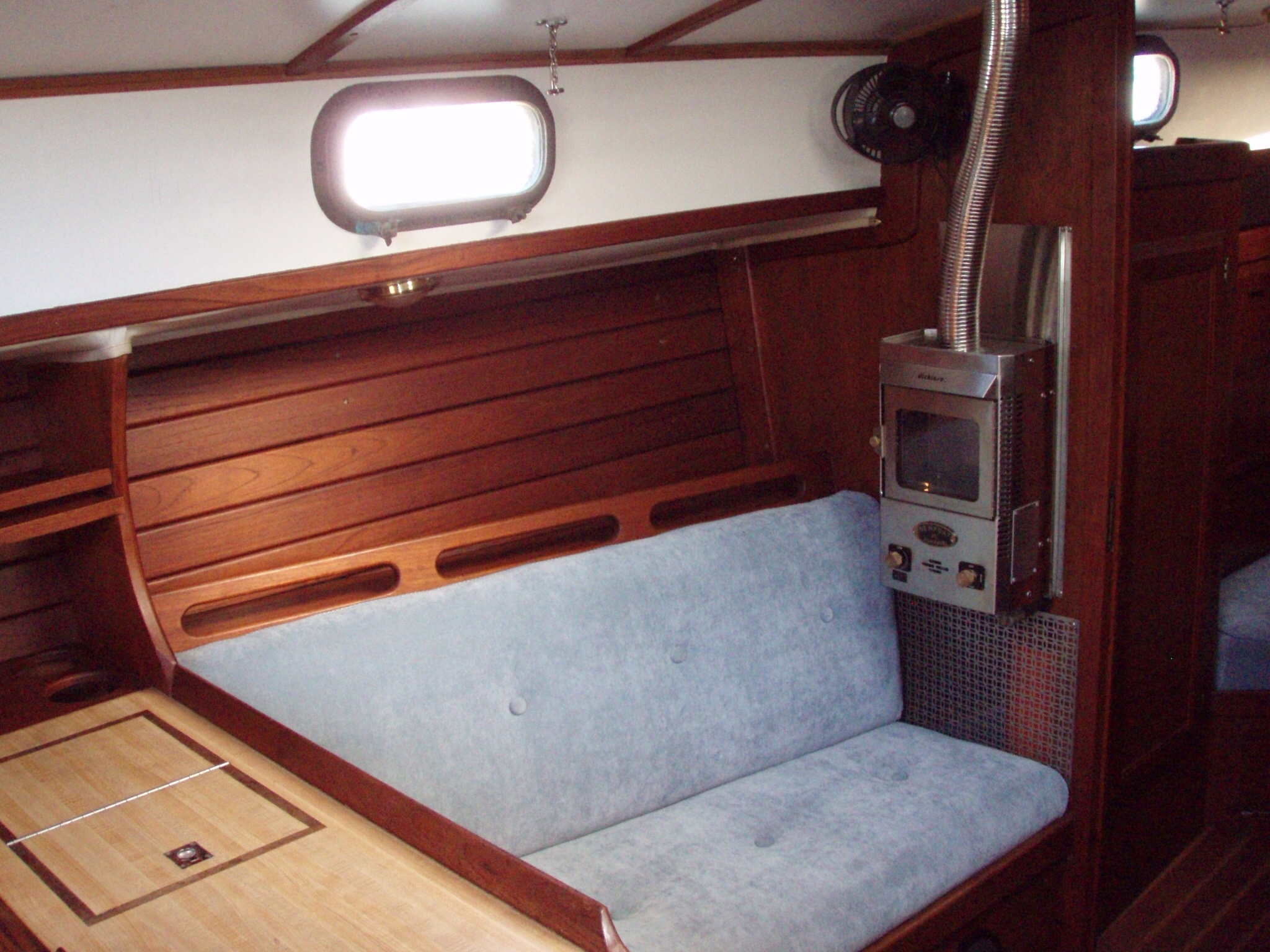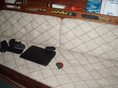 When we decided to liveaboard ‘Imi Loa instead of getting an apartment we made a few changes on the boat. The first thing we tackled was the cabin cushions. They were the original foam and the original upholstery from 1979, pretty hideous and not very comfortable. We found some fabric we liked and took a trip to Bob’s Foam Factory in Fremont for replacement foam. We knew it would be really difficult to do the work onboard so we took everything to my sister’s apartment in Richmond.
