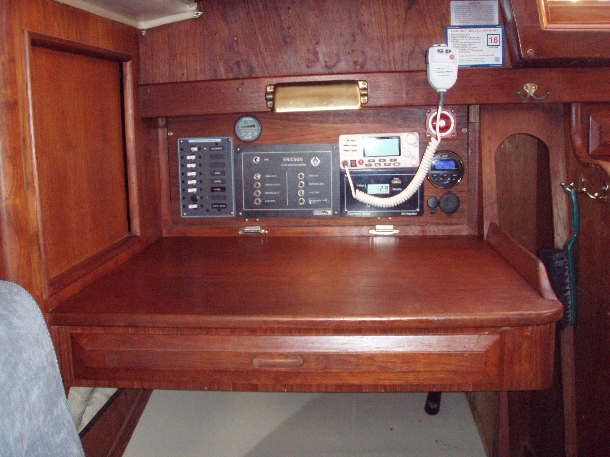 Nothing on a boat is ever straight forward so one thing led to another and we wound up relocating our DC panel from the port side (in the galley by the sink, dumb location!) to the navigation station on the starboard side, replaced all of our battery cables, installed a Xantrex Link 1000 battery moniter, put in a new battery switch, and added a secondary DC panel. While we were at it we flush mounted the VHF radio and installed a new FM stereo. I couldn’t find any photos of the Lavac and Electroscan after they were installed but who wants to look at pictures of toilets anyway?!