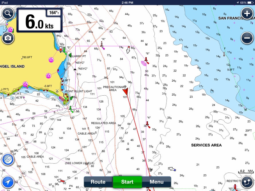 With light winds on the nose we motored all the way past point San Pedro, at which time we had 10 to 15 kn from the southwest so we raise the sails. We really need to work on the mainsail system, too much friction and to many lines getting snagged. It was way too hard to raise the main. We had run into the flood around Carquinez Strait area so it was pretty slow going, but we had a nice sail across the bay. We ended up putting a few turns in the jib and the first reef in the main in anticipation of crossing the slot, but the winds were mostly 20 to 25 kn so it was pretty comfortable except for the swell, once it gets aft of the beam it really pushes the stern around and it takes some effort to steer.