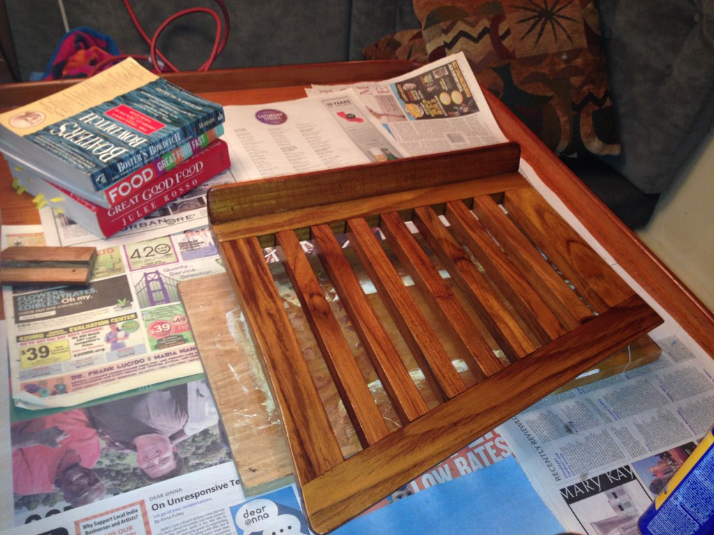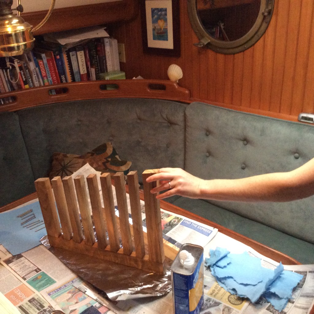 The other big improvement to the fridge is the new shelf we built. As you can see in the top picture, there is a shelf for the back half of the fridge, but the front half was just one big space with no way to organize it. Very frustrating. Our fridge has a top opening and a side opening so if we stacked bins on top of each other to fill the space, the side door wouldn’t be much use. I am aware the side door spills lots of air and isn’t efficient but I really like it. The top cover is the main counter space in the galley so it’s great to be able to get into the fridge even when in the middle of making dinner without moving everything off the top. Plus, the side door allows me to reach the bottom of the fridge without climbing in head first!