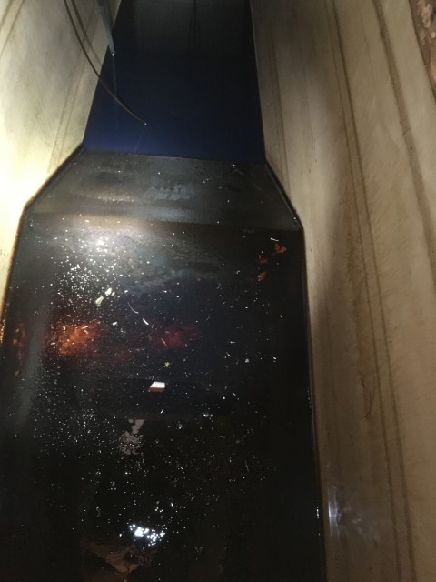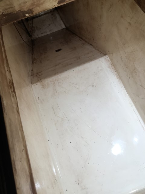 After a day of breathing fumes and getting rid of toxic waste rags and an old bed sheet used for cleaning. Looking down and aft into the cleaner tank.