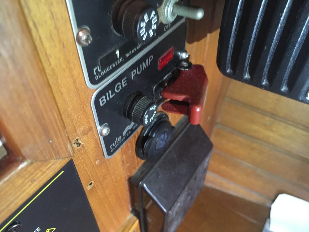 On more than one occasion we have found the switch to our automatic bilge pump in the off position. The switch is in a tight spot and it’s just a little too easy to bump it without realizing it. We discussed moving the switch to a less vulnerable location but Devon had the idea to install a guard over it. Much easier and very effective. He repurposed an old switch he had in his toolbox from his aviation days so it was free too!