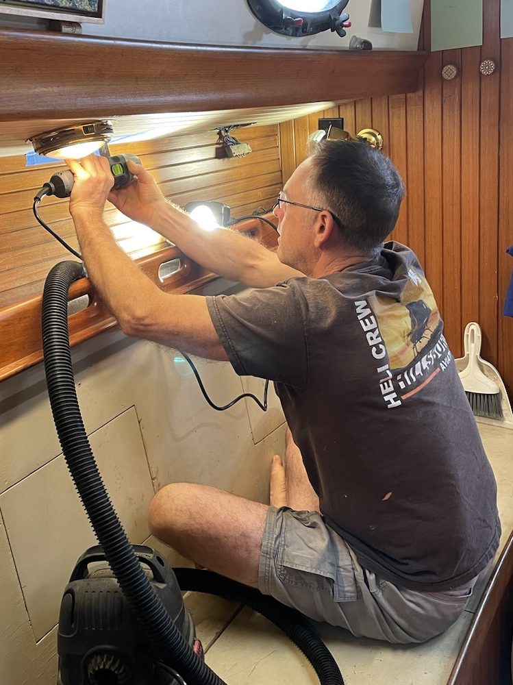 The past several weekends Devon has been working on the chain plates and the life raft mount, and I have been working on refinishing the companionway doors.