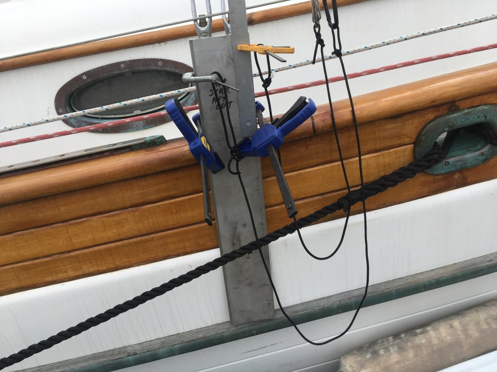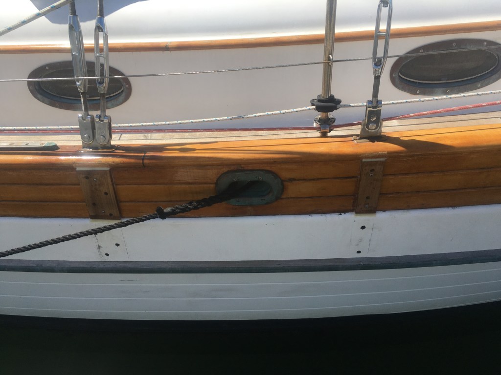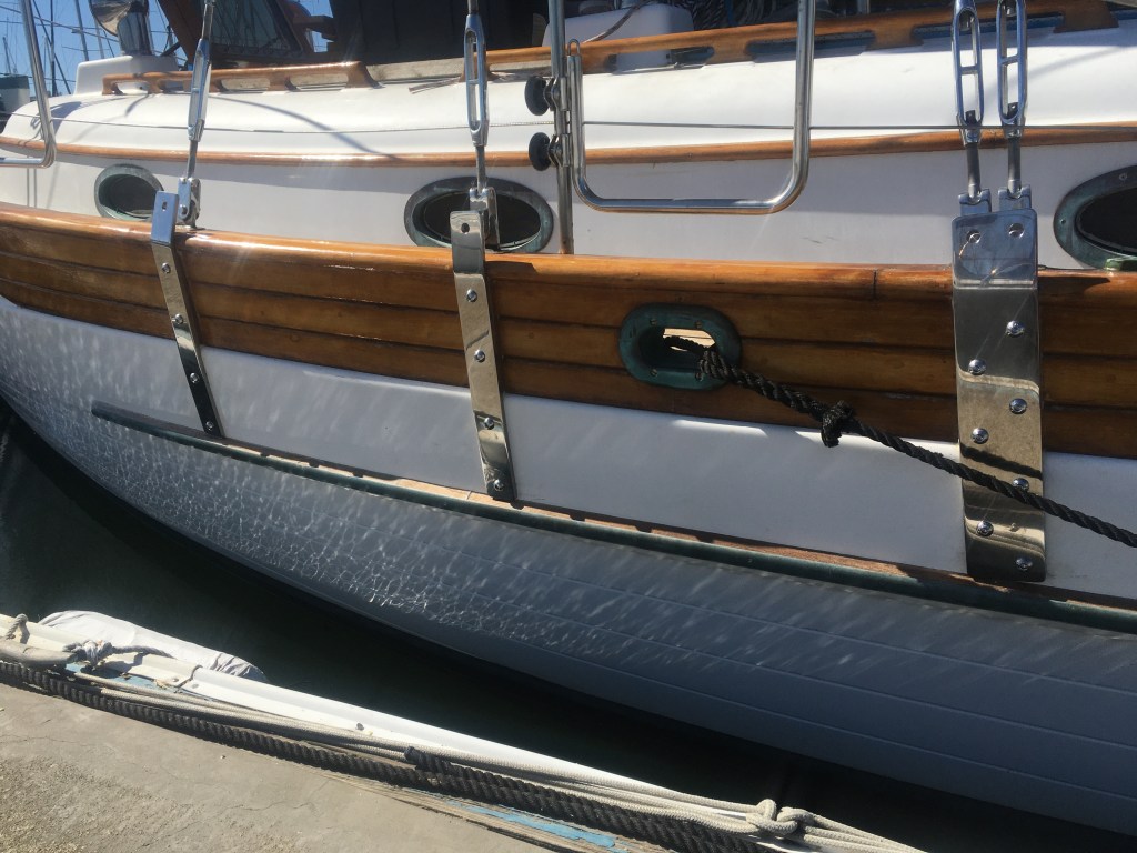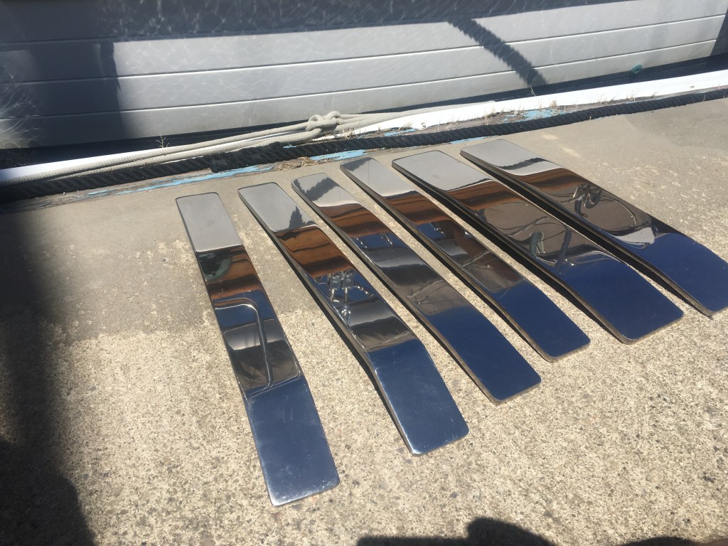 Many dock walks looking at chainplates on other boats to figure out what our final plan is. We had to choose the metal, bolts, and placement of the chainplates. We even went as far as taping aluminum foil rectangles to the boat to see what it would look like. We ended up deciding on stainless steel plates and button head bolts. We decided to leave the rub rail alone and mount the chainplates above it. The basic process to fabricate chainplates is bending, drilling, cutting, and polishing the metal. The boat modification is simply drilling the hull through the original chainplates, and getting access on the inside to install the fasteners.