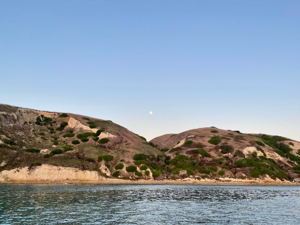 Tuesday morning dawned with a dying wind (less than 5 knots) and us entering the Santa Barbara Channel. We didn’t want to be drifting in a busy shipping channel so we motored the rest of the way to Prisoner’s Harbor on the north side of Santa Cruz Island. It turns out we had some (minor) damage to the mainsail so continuing under sail wasn’t a great option anyway. We were anchored by 6pm and ready for some uninterrupted sleep!