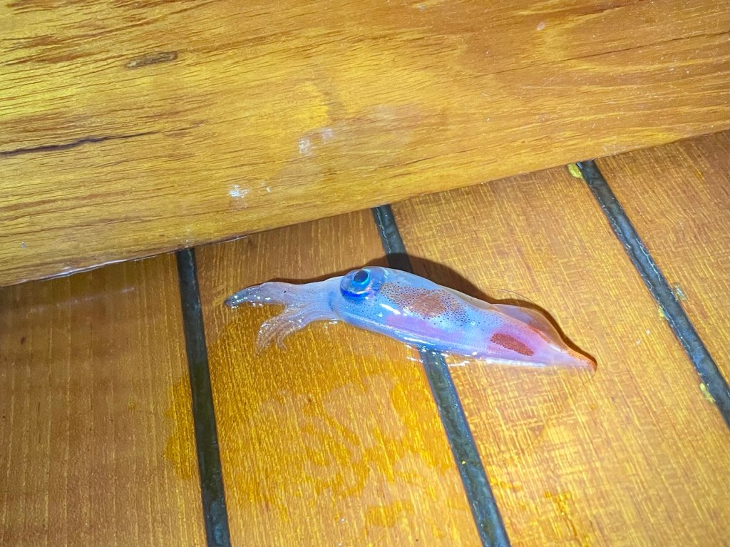 A short time later another squid hit the windscreen and after the sun came up Devon found 4 more on deck. We must have gone through a school of them feeding at the surface and they got kicked up in the spray as we went through the waves. Poor guys!