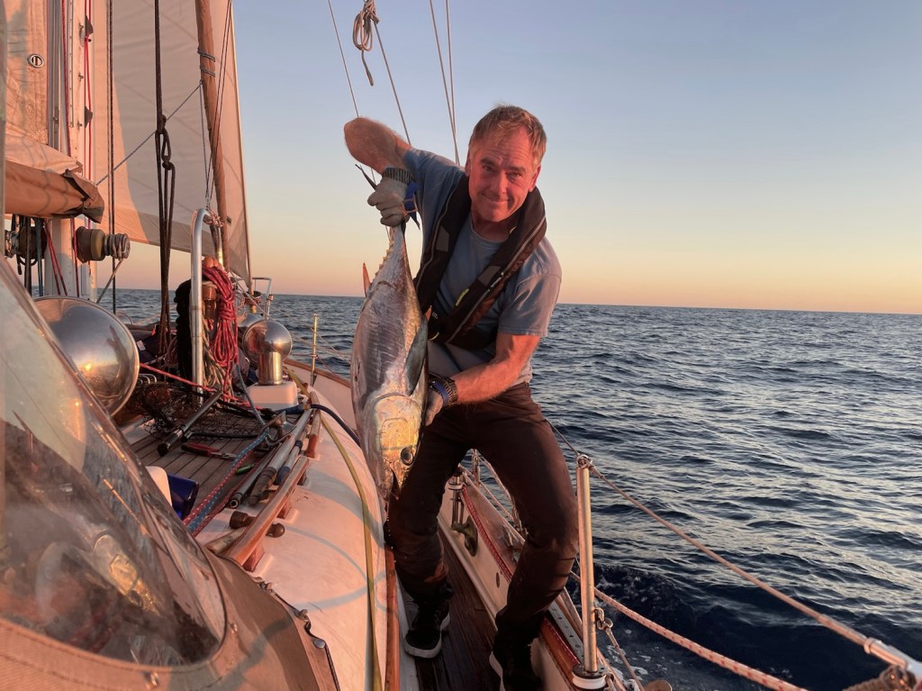 Catching the tuna was a big moment for us, it is the first time we have managed to catch a fish underway despite trying for over 10 years!! It was actually pretty overwhelming trying to deal with a fish of this size. As far as tuna goes, this is pretty modest, but it was the biggest fish by far either of us has ever caught. Trying to clean it and process it on a moving sailboat as it is rapidly getting dark was a learning experience.