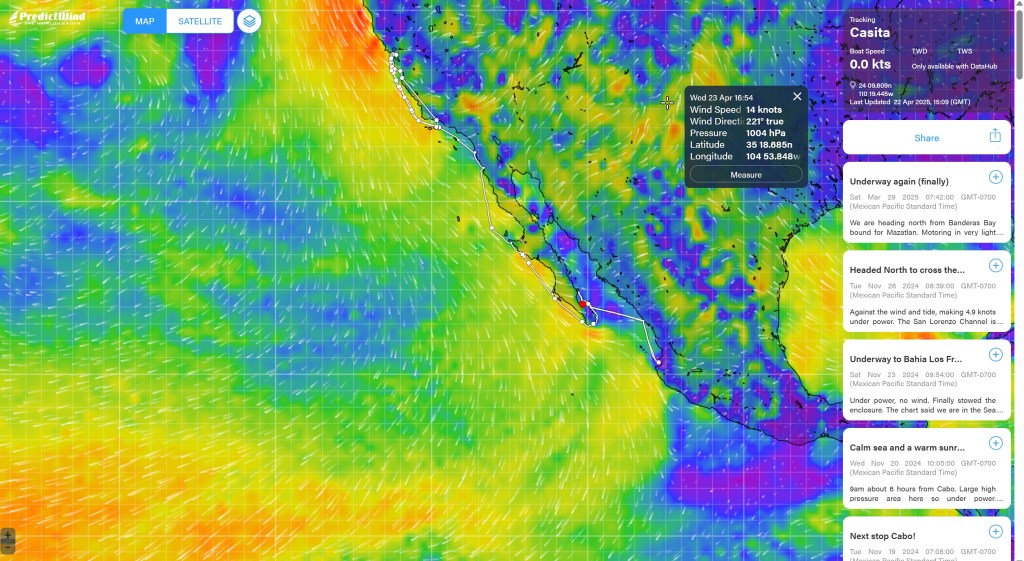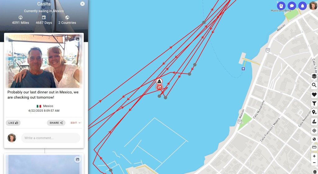 We’ve been here in La Paz for a few weeks, enjoying ourselves, relaxing, eating good food, making new friends, and getting us and Casita ready to leave for Hawaii. Well the cupboards are full, the fridge and freezer are packed to bursting, our paperwork to officially depart Mexico is done, and we are ready! We leave tomorrow. This is both very exciting and scary. This will be our longest passage by far. We will sail about 3000 nautical miles and expect it to take us 3 to 4 weeks. That means 3 to 4 weeks of being underway nonstop and sleeping no more than 4 hours at a time as someone will always need to be on watch.
