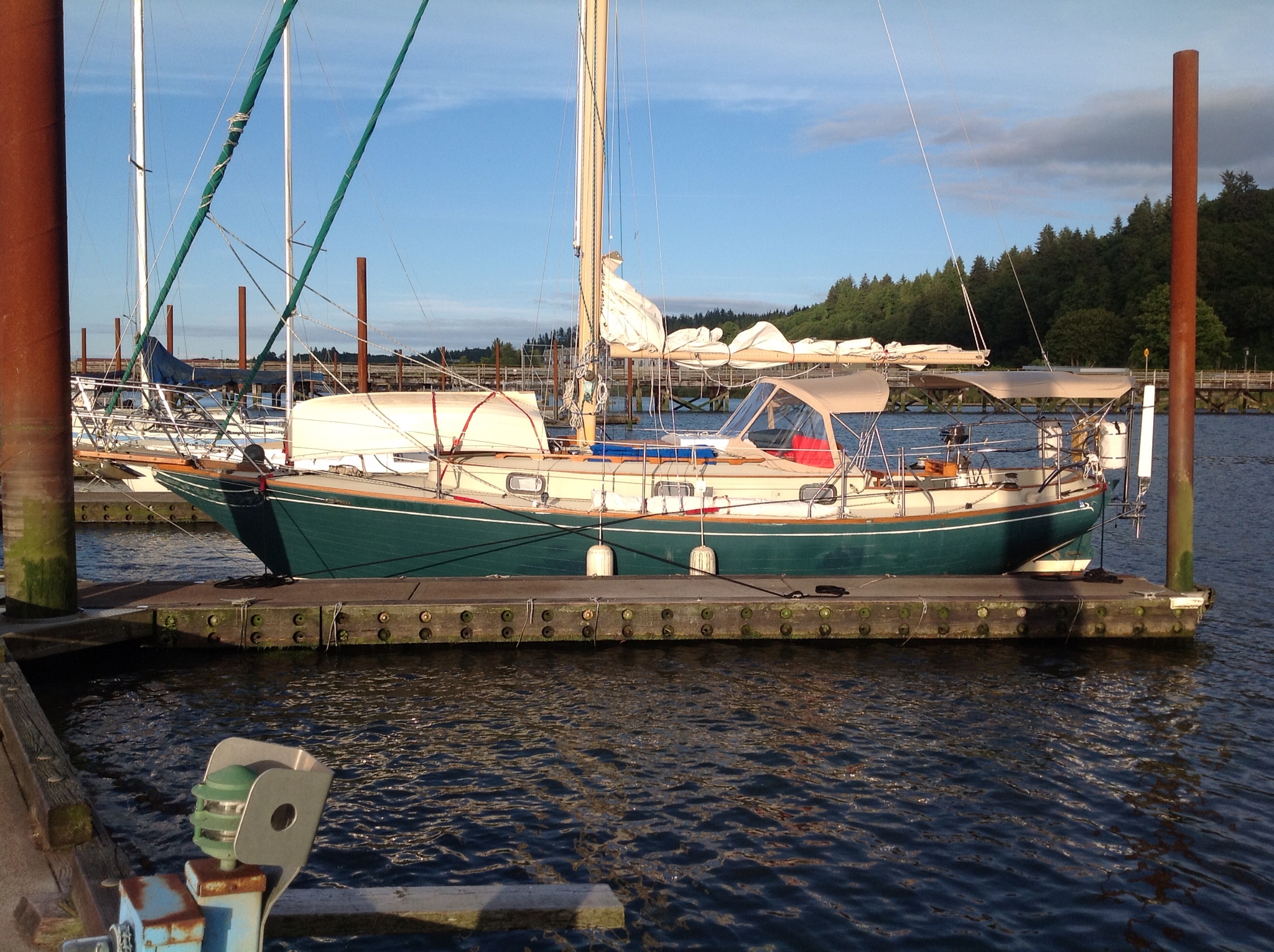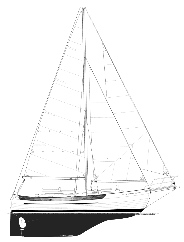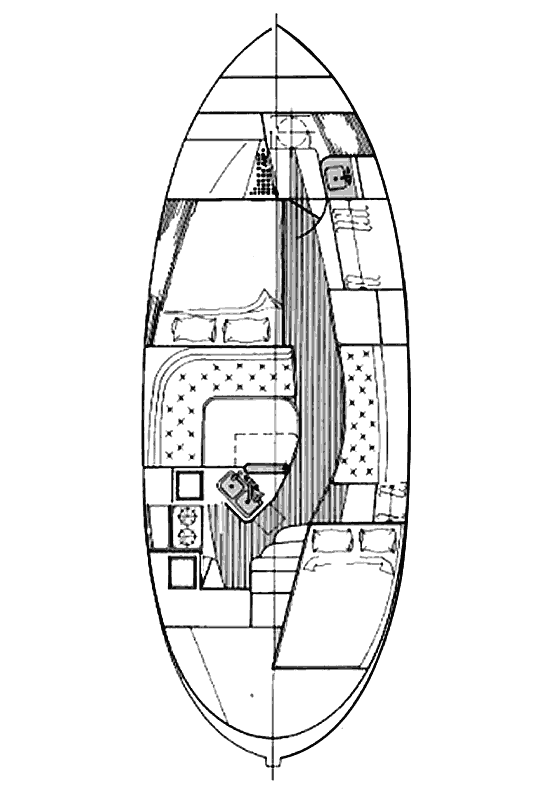 ‘Imi Loa was our first keelboat, she is a 1979 Ericson 31 Independence. She is 31’ long with a 10’5″ beam (width), and a 4’11” draft (depth below waterline) and displaces 11,400 pounds. She is constructed primarily of fiberglass with some teek trim on deck and lots of teak in the cabin. The Ericson Independence was designed for the “cruising couple” and is capable of making offshore passages. The cabin is designed to sleep 2 comfortably but can sleep as many as 5. She has some fairly modern features (for 1979 anyway) such as her modified full keel but her look is very traditional.